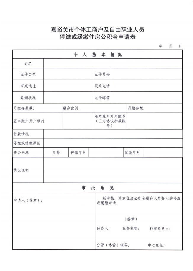 嘉峪关市个体工商户及自由职业人员停缴或缓缴住房公积金申请表