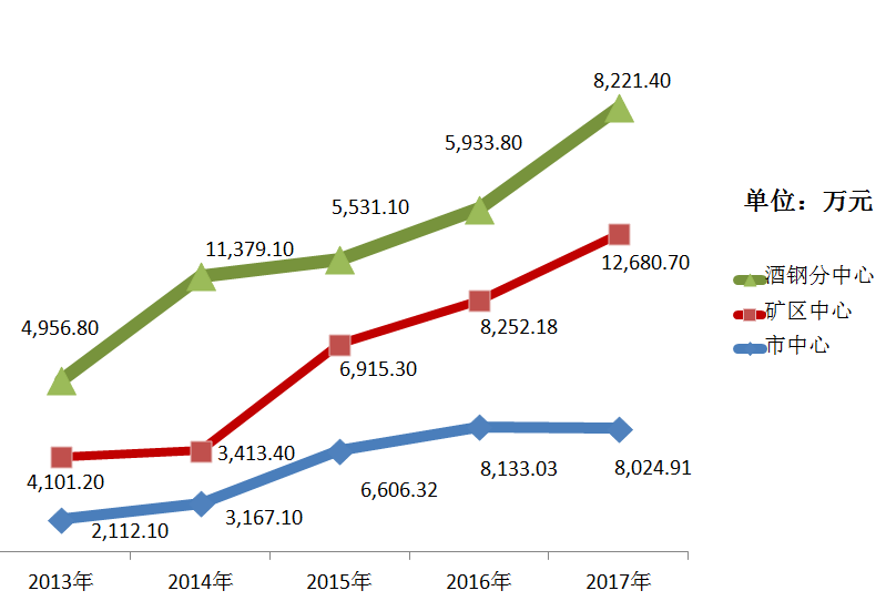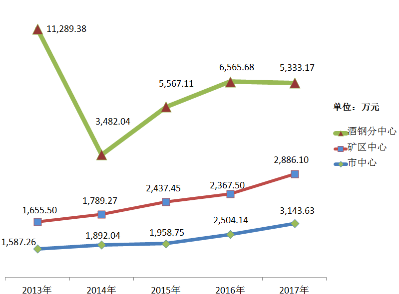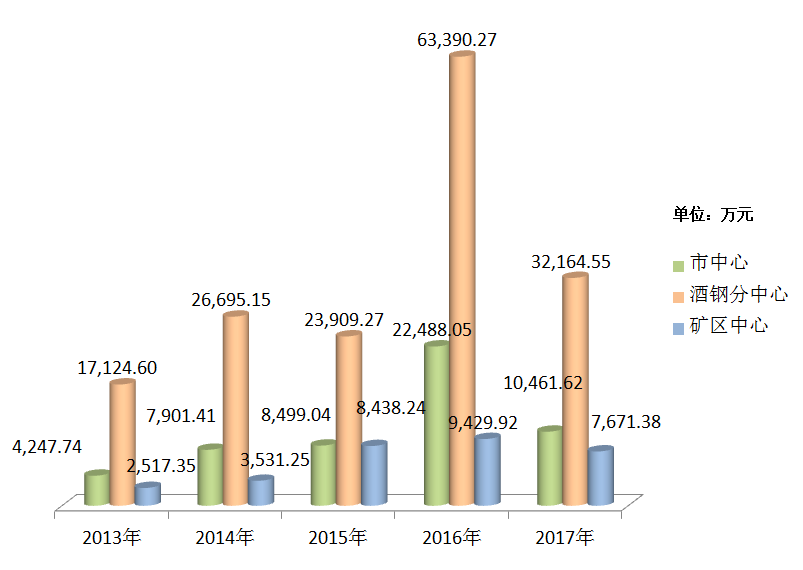 (三)增值收益:2017年,增值收益4969.14万元,同比下降12.98%。其中,市中心1335.94万元,酒钢分中心3070.72万元,矿区中心562.48万元;增值收益率1.9%,比上年减少0.27个百分点。