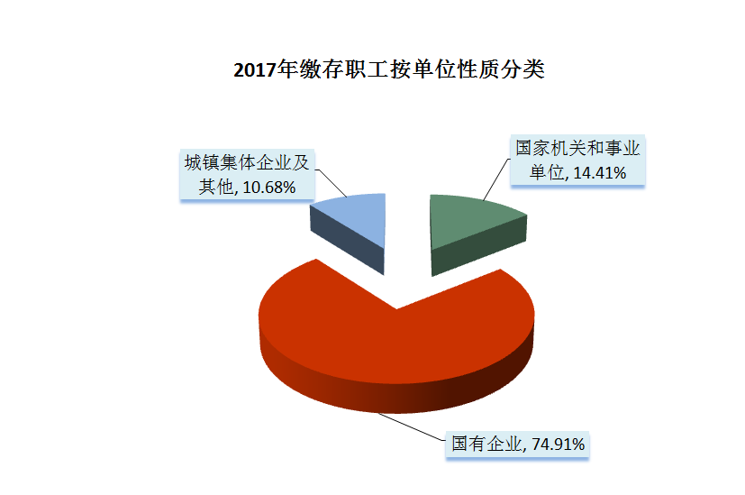 缴存职工中,国家机关和事业单位占14.41%,国有企业占74.91%,城镇集体企业占0.17%,外商投资企业占0.13%,城镇私营企业及其他城镇企业占6.07%,民办非企业单位和社会团体占0.03%,其他占4.28%;中、低收入占95.95%,高收入占4.05%。