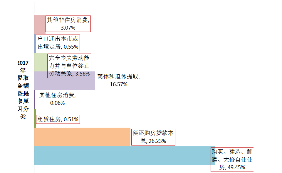 提取金额中,住房消费提取占76.25%(购买、建造、翻建、大修自住住房占49.45%,偿还购房贷款本息占26.23%,租赁住房占0.51%,其他占0.06%);非住房消费提取占23.75%(离休和退休提取占16.57%,完全丧失劳动能力并与单位终止劳动关系提取占3.56%,户口迁出本市或出境定居占0.55%,其他占3.07%)。