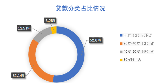 贷款职工中,30岁(含)以下占52.07%,30岁-40岁(含)占32.14%,40岁-50岁(含)占12.51%,50岁以上占3.28%;购买首套住房申请贷款占68.30%,购买二套及以上申请贷款占31.70%;中、低收入占98.27%,高收入占1.73%。