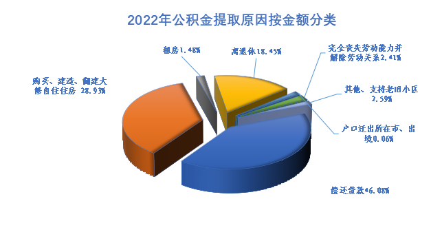 提取金额中,购买、建造、翻建、大修自住住房占28.93%,偿还购房贷款本息占46.08%,租赁住房占1.48%,支持老旧小区改造占0.07%,离休和退休提取占18.45%,完全丧失劳动能力并与单位终止劳动关系提取占2.41%,出境定居占0.06%,其他占2.52%。