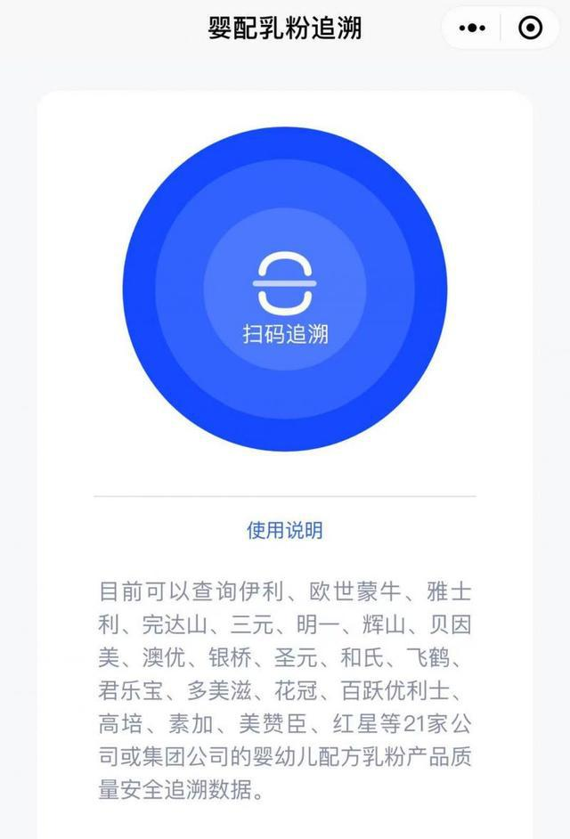 1、“婴配乳粉追溯”微信小程序、“婴配乳粉追溯”抖音小程序。查询方法:通过微信APP或抖音APP分别扫描对应的小程序二维码,打开小程序点击“扫码追溯”,扫描产品包装上的追溯二维码即可获得产品信息。