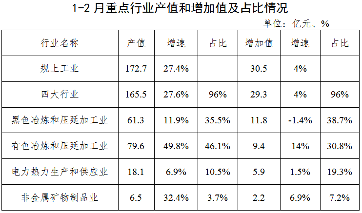 从重点行业看,1-2月,黑色、有色、电力热力供应、非金属矿物制品四个重点行业,完成工业总产值165.5亿元,同比增长27.6%,完成工业增加值29.3亿元,同比增长4%,占全市规上工业增加值96%。