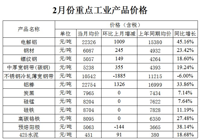 从重点工业产品价格看,2月份,重点工业产品价格保持高位,除不锈钢冷轧薄宽钢带同比下降6%以外,电解铝、钢材、铝棒、炭黑、硅锰、硅铁、高碳铬铁、预焙阳极、425水泥分别同比增长45.2%、23.4%、33.9%、7.1%、7.6%、11.2%、27.5%、38%、18.7%。