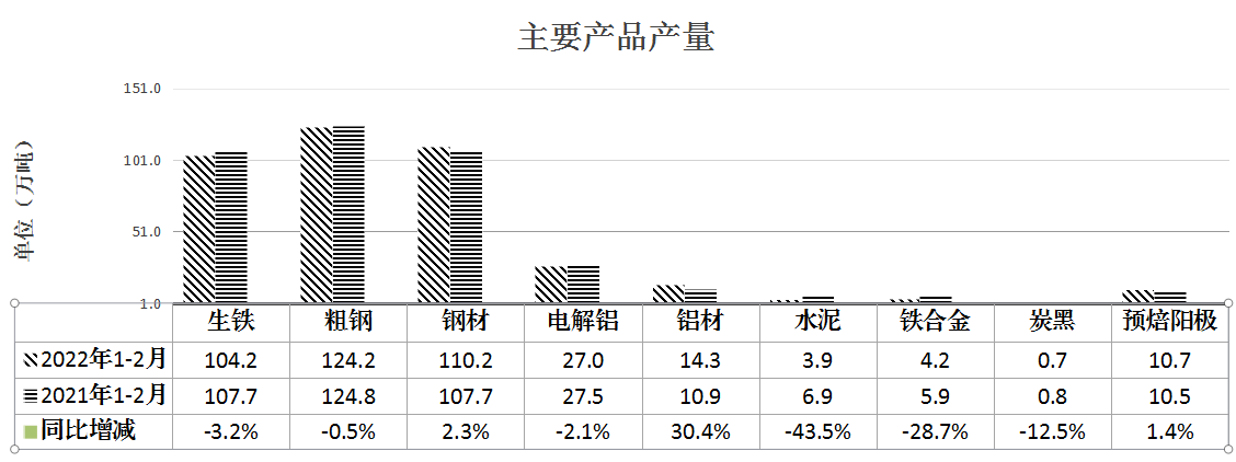 从主要产品产量看,1-2月,全市规上工业企业主要产品产量同比“三升六降”。其中,钢材、铝材、预焙阳极产量同比增长2.3%、30.4%、1.4%;生铁、粗钢、电解铝、水泥、铁合金、炭黑产量同比下降3.2%、0.5%、2.1%、43.5%、28.7%、12.5%。
