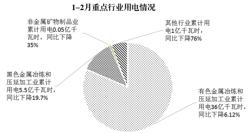 从用电情况看,1-2月,工业用电量42.5亿千瓦时,同比下降14.1%(剔除统计口径影响,实际下降1.65%),占全市用电量98%(全市43.4亿千瓦时);规上工业用电量42.1亿千瓦时,下降14.1 %,占全市工业用电量99%;其中:黑色、有色、非金属三大行业用电量41.5亿千万时,同比下降8.2%,占工业用电量97.6%。