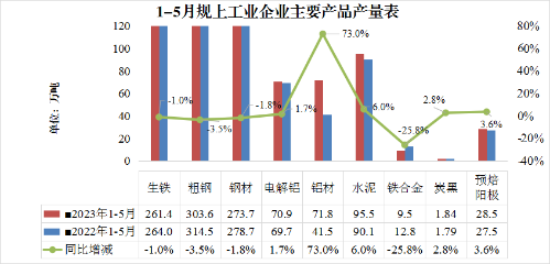 从主要产品产量看,1-5月,重点监控的9种工业产品产量同比“五升四降”,铝材、水泥、预焙阳极、炭黑和电解铝产量分别增长73%、6%、3.6%、2.8%和1.7%;铁合金、粗钢、钢材和生铁产量同比分别下降25.8%、3.5%、1.8%和1%。