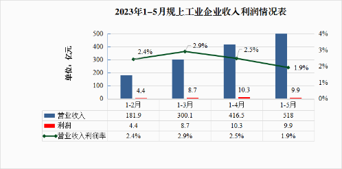 从企业盈利看,1-5月,规上企业实现利润9.9亿元,同比下降73.4%。