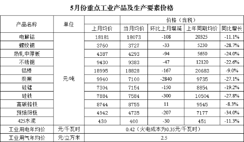 从重点工业产品价格看,5月份,重点监控的11种工业产品价格均同比下降,预焙阳极、螺纹钢、硅铁、炭黑、热轧中厚板、不锈钢、硅锰、425水泥、电解铝、铝棒和高碳铬铁分别同比下降34%、28.7%、27.8%、27.1%、24%、22.6%、19.2%、11.3%、11.1%、9%和8.3%。