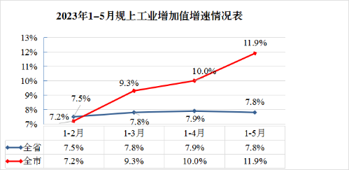 5月,规上企业完成工业总产值104亿元,同比增长5.8%;实现工业增加值15.6亿元,同比增长19.1%,创24个月以来新高。1-5月,规上企业完成工业总产值515亿元,同比增长7.4%;实现工业增加值77.1亿元,同比增长11.9%,增速较上月提升1.9个百分点,居全省14个市州第3位。