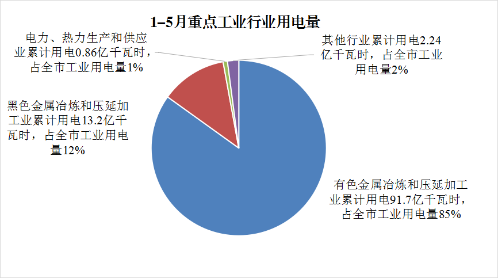 从用电情况看,1-5月,全市工业用电量108亿千瓦时(占全市用电量110亿千瓦时98.2%),同比增长0.28%。分行业看,黑色行业用电量13.2亿千瓦时,同比下降5.6%(主要是铁合金企业停产减产);有色行业用电量91.7亿千瓦时,同比增长1.28%;电力、热力生产和供应业用电量0.86亿千瓦时,同比增长17.18%;非金属矿物制品业用电量0.6亿千瓦时,同比下降1.75%。