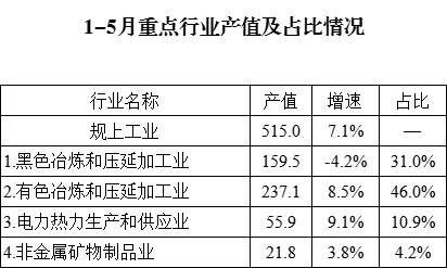 从重点行业看,1-5月,黑色、有色、电力热力生产供应、非金四个重点行业完成工业总产值474.3亿元(占全市规上工业总产值92.1%),同比增长3.8%。其中:黑色冶炼和压延加工业完成工业总产值159.5亿元,同比下降4.2%;有色冶炼和压延加工业完成工业总产值237.1亿元,同比增长8.5%;电力、热力生产和供应业完成工业总产值55.9亿元,同比增长9.1%;非金属矿物制品业完成工业总产值21.8亿元,同比增长3.8%。