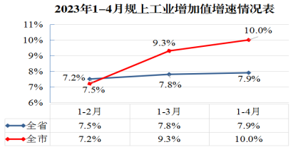 4月,规上企业完成工业总产值103.2亿元,同比增长3.5%;实现工业增加值15.2亿元,同比增长12.1%。1-4月,规上企业完成工业总产值411亿元,同比增长8.9%;实现工业增加值61.3亿元,同比增长10%,较一季度提升0.7个百分点,居全省第4位。