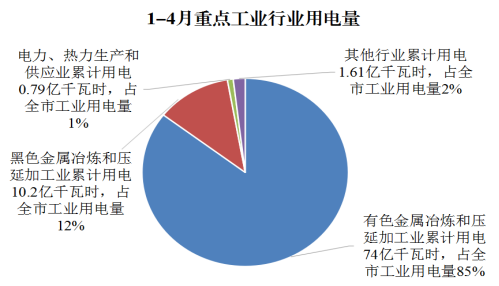 从用电情况看,1-4月,全市工业用电量86.6亿千瓦时(占全市用电量88.1亿千瓦时98.3%),同比增长0.7%。分行业看,黑色行业用电10.2亿千瓦时,同比下降6.1%;有色行业用电74亿千瓦时,同比增长1.8%;电力、热力生产和供应业用电0.79亿千瓦时,同比增长24.7%;非金属矿物制品业用电0.37亿千瓦时,同比下降7.2%。全市完成发电量68亿千瓦时,同比下降6.7%。其中,光伏企业完成发电量3.58亿千瓦时,同比增长3.3%。