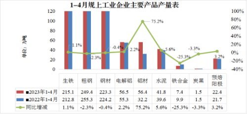 主要产品产量看,1-4月,重点监控的9种工业产品产量同比“五升四降”,铝材、水泥、预焙阳极、电解铝和生铁产量分别增长75.2%、5.6%、3.2%、2.3%和1.1%,铝材产量增长较快;铁合金、炭黑、粗钢和钢材产量同比分别下降25.3%、3.3%、2.3%和0.4%。