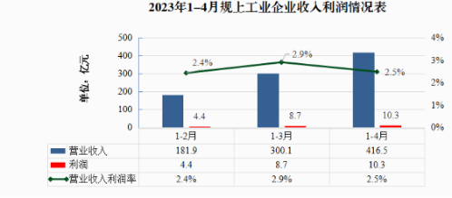 从企业盈利看,1-4月,规上企业实现利润10.3亿元,同比下降69.5%。规上企业实现营业收入416.5亿元,同比增长7.9%。