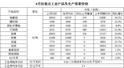 从重点工业产品价格看,4月,重点监控的11种工业产品价格同比“三升八降”,炭黑、高碳铬铁和425水泥价格分别同比增长23%、5.2%和2%,不锈钢、螺纹钢、电解铝、硅铁、硅锰、铝棒、热轧中厚板和预焙阳极价格分别同比下降22.9%、22.4%、16.2%、16.1%、11.7%、10.6%、9.8%和4.1%。