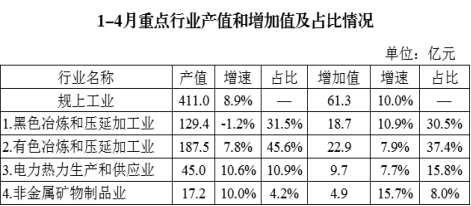 从重点行业看,1-4月,黑色、有色、电力热力生产供应、非金属矿物制品四个重点行业完成工业总产值379.1亿元(占全市规上工业总产值92.2%),同比增长4.9%。完成工业增加值56.2亿元(占全市规上工业增加值92%)。其中:黑色行业增加值增速10.9%;有色行业增加值增速7.9%;电力、热力生产和供应业增加值增速7.7%;非金属矿物制品业增加值增速15.7%。