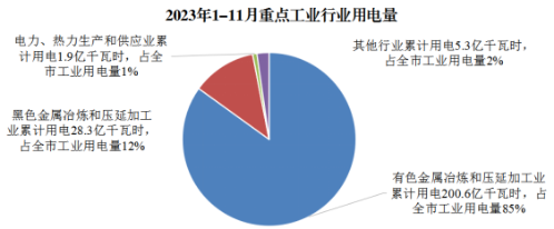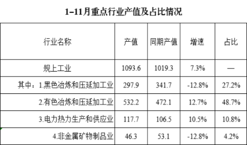 从重点行业看,黑色、有色、电力热力生产供应、非金属四大重点行业整体向好,对我市规上工业经济高位运行做出重要贡献,1-11月,四大重点行业完成工业总产值994.1亿元(占全市规上工业总产值90.9%),同比增长2.1%,增速较1-10月提升0.4个百分点。其中: