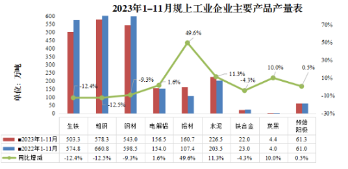 从产量看,主要产品产量五升四降。1-11月,9种重点监控的工业产品产量,铝材160.7万吨,同比增长49.6%;水泥226.5万吨,同比增长11.3%;炭黑4.4万吨,同比增长10%;电解铝156.5万吨,同比增长1.6%;预焙阳极61.3万吨,同比增长0.5%;铁合金22万吨,同比下降4.3%;钢材543万吨,同比下降9.3%;生铁503.3万吨,同比下降12.4%;粗钢578.3万吨,同比下降12.5%。