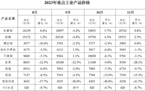 从重点监控产品价格看,11月,重点监控的10种产品均价,铝价小幅上涨,其中,电解铝均价增长0.8%,铝棒均价增长2.5%。钢价较上月有所回弹,螺纹钢均价同比增长6%,较10月提升8.4个百分点,热轧中厚板均价同比下降1.1%,降幅较10月收窄5.5个百分点,不锈钢均价同比下降3.1%,较10月收窄3个百分点。炭黑均价较上月大幅下跌,同比下降28.1%,降幅较10月扩大19.1个百分点。其他重点监测产品涨跌幅度与上月基本持平,硅锰均价同比下降9.7%、硅铁均价同比下降15.3%,预焙阳极均价同比下降41.5%,425水泥均价同比下降8.7%。