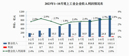 从企业盈利能力看,1-10月,规上企业实现利润28.6亿元,同比下降30.3%,营业收入利润率2.8%,比1-10月提升0.1个百分点。