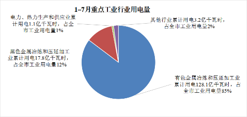 先行指标保障有力。1-7月,全市工业用电量150.2亿千瓦时(占全市用电量98.3%),同比基本持平。分行业看,黑色行业用电量17.8亿千瓦时,同比下降6.2%;有色行业用电量128.1亿千瓦时,同比增长0.03%;电力、热力生产和供应业用电量1.1亿千瓦时,同比增长9.7%;非金属矿物制品业用电量1亿千瓦时,同比增长0.98%。全市天然气供应量10604万立方米,其中:工业用气量为8780万立方米,同比增长65%,供应形势稳定。全市工业企业贷款余额377.91亿元,同比增长5.74%,其中:工业中小企业贷款余额56.15亿元,同比增长12.25%。