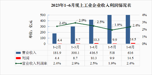 企业盈利能力持续向好。1-6月,规上企业实现利润14.5亿元,分别比1-2月增加10.1亿元、1-3月增加5.8亿元、1-4月增加4.2亿元、1-5月增加4.6亿元。规上企业实现营业收入616亿元,同比增长6.5%。