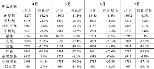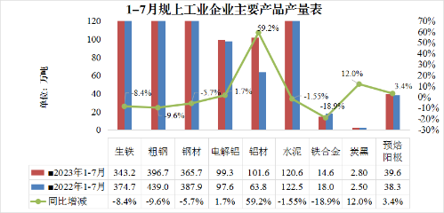 主要产品产量下降面扩大。7月,9种重点监控的工业产品产量“三升六降”,产量下降的产品较6月增加1种。1-7月,9种重点监控的工业产品产量“四升五降”,产量下降的产品较1-6月增加1种。其中,铝材101.6万吨,同比增长59.2%;炭黑2.8万吨,同比增长12%;预焙阳极39.6万吨,同比增长3.4%;电解铝99.3万吨,同比增长1.7%;铁合金14.6万吨,同比下降18.9%;粗钢396.7万吨,同比下降9.6%;生铁343.2万吨,同比下降8.4%;钢材365.7万吨,同比下降5.7%;水泥120.6万吨,同比下降1.55%。