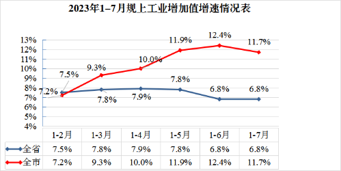1-7月,全市工业战线团结一心、加压奋进,认真贯彻落实省委省政府和市委市政府经济调度会议精神,全力以赴强工业、稳增长、抓项目、促发展。7月,全市规上企业完成工业总产值96.7亿元,同比增长4.4%,规上工业增加值增长7.2%,增速较6月回落8个百分点。1-7月,规上企业完成工业总产值713.6亿元,同比增长7%,规上工业增加值增长11.7%,增速较1-6月回落0.7个百分点。