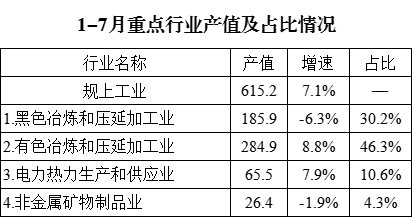四大重点行业产值增速放缓。1-7月,黑色、有色、电力热力生产供应、非金四个重点行业完成工业总产值652.9亿元(占全市规上工业总产值91.5%),同比增长2.6%,增速较1-6月回落4.3个百分点。四大行业产值增长两极分化明显,其中:黑色