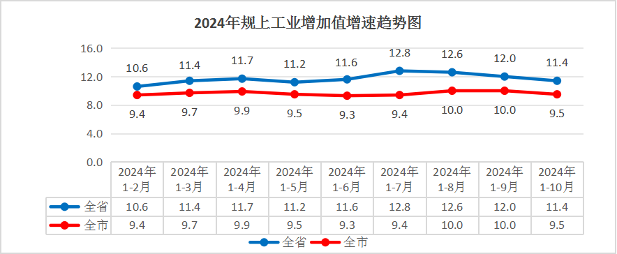 10月份,全市规上工业经济总体延续平稳增长态势,但增速放缓。10月当月,规上工业企业完成总产值100.9亿元,同比增长2.5%,增加值同比增长4.5%,环比9月份回落5.1个百分点。1-10月,规上工业企业完成总产值1101亿元,同比增长9.7%,增加值同比增长9.5%,增速比1-9月回落0.5个百分点,排全省第7位,位次与1-9月相同。
