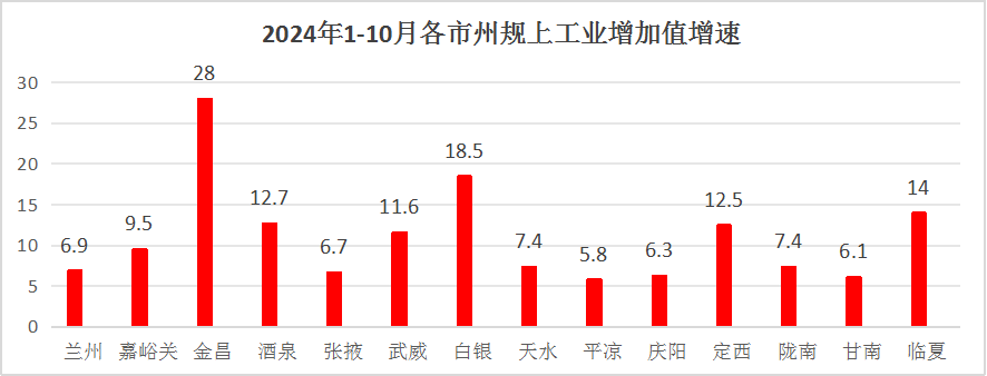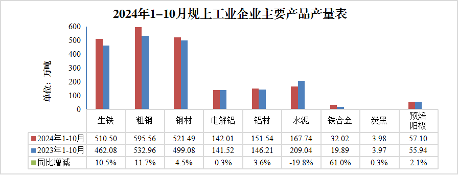 从重点行业看,10月当月,四大重点行业完成总产值91.9亿元(占全市规上工业总产值91%),同比增长3.9%,增速比9月回落5.8个百分点。其中:黑色冶炼和压延加工业(产值占规上工业总产值24.9%)完成总产值25.1亿元,同比增长3.8%,环比9月回落21.6个百分点。生产钢材50.4万吨,同比增长13%,环比9月减少1.7万吨。有色冶炼和压延加工业(产值占规上工业总产值52.2%),因产品市场价格有所回升,完成总产值52.6亿元,同比增长5.2%,比9月提升1.2个百分点。生产电解铝14.2万吨,同比下降1.2%,环比9月增加0.4万吨。铝材14.2万吨,同比下降0.76%,环比9月减少1.2万吨。电力、热力生产和供应业(产值占规上工业总产值10.6%),受天气及新能源消纳等原因影响,完成总产值10.7亿元,同比增长2.3%,比9月回落1.2个百分点。非金属矿物制品业(产值占规上工业总产值3.5%),受基础设施建设领域项目少、预焙阳极价格持续下跌等因素影响,10月完成总产值3.5亿元,同比下降8.6%,比9月回落13.8个百分点。