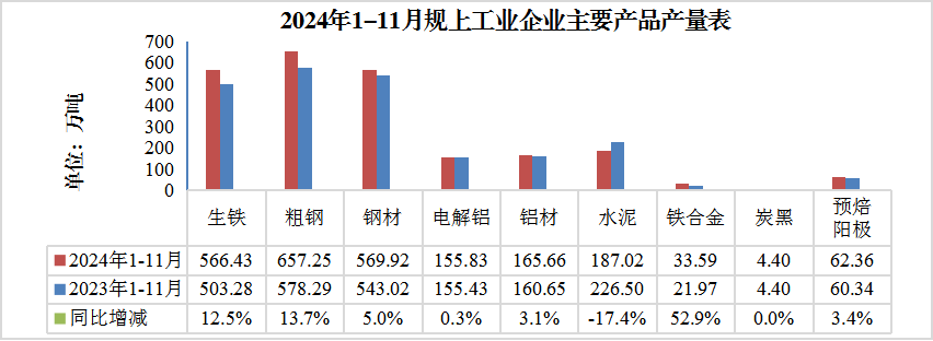虽然11月当月增速有所提升,但我市工业经济仍存在较多不利因素:一是受市场需求不足、产品价格下跌影响,13户中小企业停产或减产(主要涉及建材和选矿行业),下拉当月0.6个百分点。重点监控的10种工业产品价格总体呈下降趋势。其中:螺纹钢价格同比下跌592元、炭黑价格同比下跌750元、硅锰价格同比下跌480元、硅铁价格同比下跌780元、预焙阳极价格已连续12个月下跌,同比下跌498元。二是为提升生产设备性能、提高生产运行效率,部分企业生产线停产检修,下拉当月1个百分点。三是10户光伏企业(不含今年下半年新入规的索通清能和核聚新能)受新交易规则影响,下拉当月0.3个百分点。