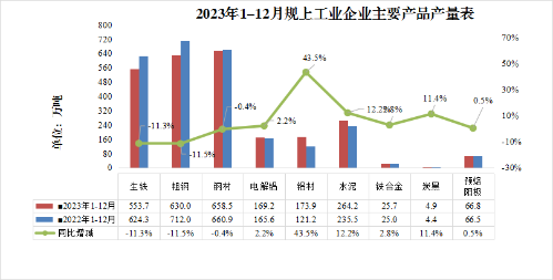 从产品产量看,主要产品产量六升三降,1-12月,9种重点监控的工业产品产量,铝材173.9万吨,同比增长43.5%;水泥264.2万吨,同比增长12.2%;炭黑4.9万吨,同比增长11.4%;铁合金25.7万吨,同比增长2.8%;电解铝169.2万吨,同比增长2.2%;预焙阳极66.8万吨,同比增长0.5%;钢材658.5万吨,同比下降0.4%;生铁553.7万吨,同比下降11.3%;粗钢630万吨,同比下降11.5%。