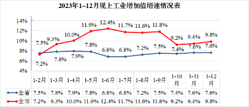 12月当月,全市规上工业企业完成总产值90.5亿元,同比增长9.1%,实现增加值13.8亿元,同比增长14.1%。1-12月,规上工业企业完成总产值1184亿元,同比增长7.3%,实现增加值178亿元,同比增长9.8%,排全省第4位。