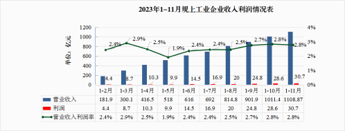 从企业盈利能力看,1-11月,规上企业实现利润30.7亿元,同比下降25.5%,比1-10月收窄4.8个百分点,营业收入利润率2.8%。