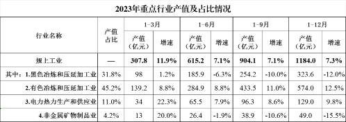 黑色冶炼和压延加工业,受产品价格持续下降及粗钢限产影响,二季度开始产值同比负增长且降幅逐季度扩大。2023年,黑色金属冶炼及压延加工企业共10户,比2022年增加2户(铭宇选矿公司、明瑞祥矿业公司),全年完成工业总产值323.6亿元,同比下降12%,其中,一季度增长1.2%、二季度下降6.3%、三季度下降10%;累计生产钢材658.5万吨,粗钢630万吨,铁合金25.7万吨。该行业产值增速持续下降,主要原因在于钢材均价持续下跌,6月份跌破5000元/吨,7月份起跌破4000元/吨,全年均价同比下降9.3%。