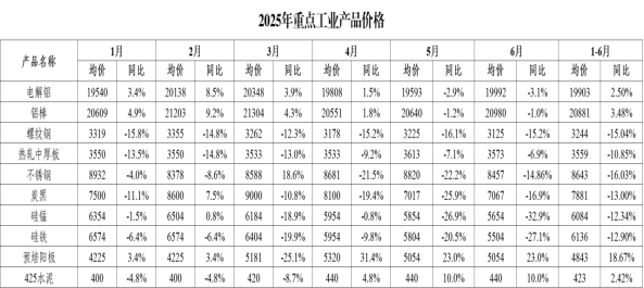 重点监控产品价格延续下行态势。受全球大宗商品市场波动和国内需求减弱影响,6月份,重点监测的10种产品价格同比“2升8降”,增长面20%。黑色金属行业产品价格持续下降,螺纹钢3125元、同比下降15.2%、环比下降3.1%;热轧中厚板3573元、同比下降6.9%、环比下降1.1%;不锈钢8457元、同比下降14.86%、环比下降4.1%;硅锰5654元、同比下降32.9%、环比下降3.4%;硅铁5504元、同比下降27.1%、环比下降6.9%。有色行业产品价格呈下降趋势,电解铝均价同比下降3.1%、降幅比1-5月扩大0.2个百分点;铝棒均价同比下降1%、降幅比1-5月收窄0.2个百分点。非金属行业产品价格上涨,预焙阳极、425水泥两种产品价格分别上涨946元/吨、上涨40元/吨。炭黑7067元/吨,环比小幅上涨50元/吨,同比下跌1433元/吨。