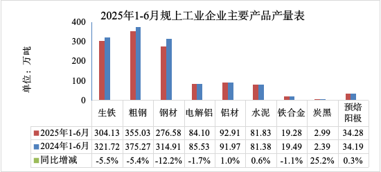 重点监控产品产量“四升五降”。上半年重点监测的9种产品4种产量保持增长。钢铁板块产品产量受价格持续下跌及酒钢2#高炉检修影响产量下降,其中:粗钢下降5.4%;生铁下降5.5%;钢材下降12.2%;铁合金下降1.1%。铝板块产品产量总体稳产,其中:铝材增长1%;电解铝基本持平;预焙阳极增长0.3%。建材类产品中水泥产量小幅增长0.6%。炭黑产量增长较快,生产炭黑2.99万吨,增长25.2%。