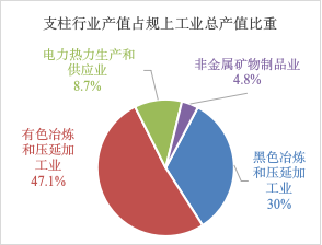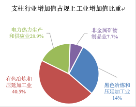 四大重点行业“三增一降”。上半年,四大重点行业完成工业总产值630.7亿元(占全市规上工业总产值91%),同比增长3%,对全市规上工业贡献率达到124.2%。其中:黑色冶炼和压延加工业完成产值208.9亿元,同比增长4.3%,贡献率58.2%;有色冶炼和压延加工业完成产值328.1亿元,同比增长3%,贡献率65.88%;非金属矿物制品业因重点产品价格上涨(预焙阳极价格5054元/吨,同比上涨946元)完成产值33.3亿元,同比增长38.1%,贡献率62.64%;电力、热力生产和供应业完成产值60.4亿元,同比下降13.2%,贡献率-62.5%。