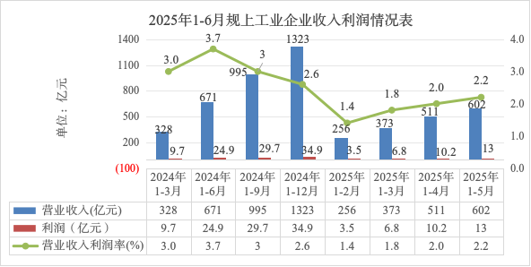 企业经营效益和盈利水平降幅收窄。1-5月,规上工业企业实现主营业务收入602亿元,同比增长7.3%。实现利润13亿元,同比下降30.6%,降幅比1-4月收窄6.8个百分点。营业收入利润率2.2%,分别比一季度、1-4月提升0.4、0.2个百分点。
