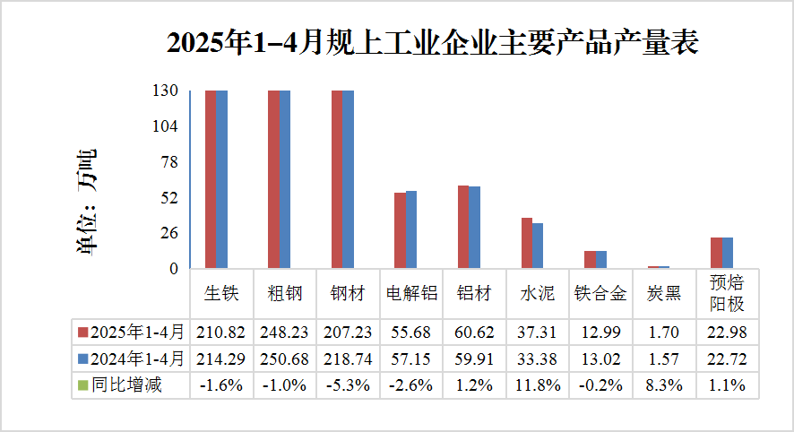 4种重点产品产量同比增长。1-4月,重点监控的9种工业产品产量“四升五降”。其中,铝材60.62万吨,增长1.2%;水泥37.31万吨,增长11.8%;炭黑1.7万吨,增长8.3%;预焙阳极22.98万吨,增长1.1%;粗钢248.23万吨,下降1%;生铁210.82万吨,下降1.6%;钢材207.23万吨,下降5.3%;电解铝55.68万吨,下降2.6%;铁合金12.99万吨,下降0.2%。
