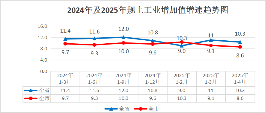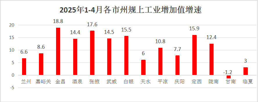1-4月,全市规上工业经济总体延续平稳增长态势,但因酒钢公司2#高炉自4月1日至10月30日超低排改造停产影响,规上工业工业增加值增速放缓。4月当月,全市规上工业企业完成总产值110.5亿元,同比下降3.7%,增加值同比增长7%。1-4月,规上工业企业完成总产值475.7亿元,同比增长6.2%,增加值同比增长8.6%,较一季度回落0.5个百分点,排全省第9位,比去年同期排名上升1位。