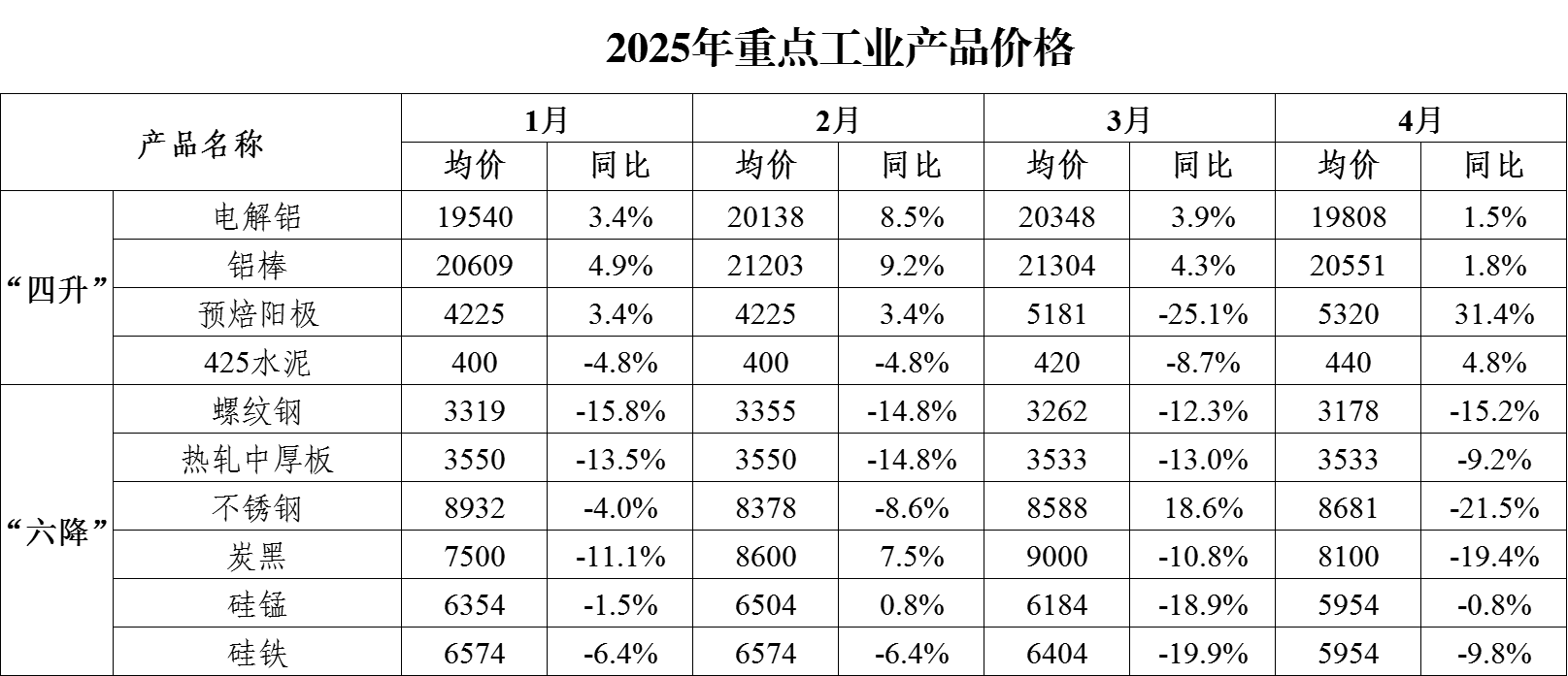 重点监控产品价格“四升六降”。4月份,电解铝上涨291元、铝棒上涨357元、预焙阳极上涨1272元、425水泥上涨20元。螺纹钢下跌572元、热轧中厚板下跌357元、不锈钢下跌2375元、炭黑下跌1950元、硅锰下跌50元、硅铁下跌650元。