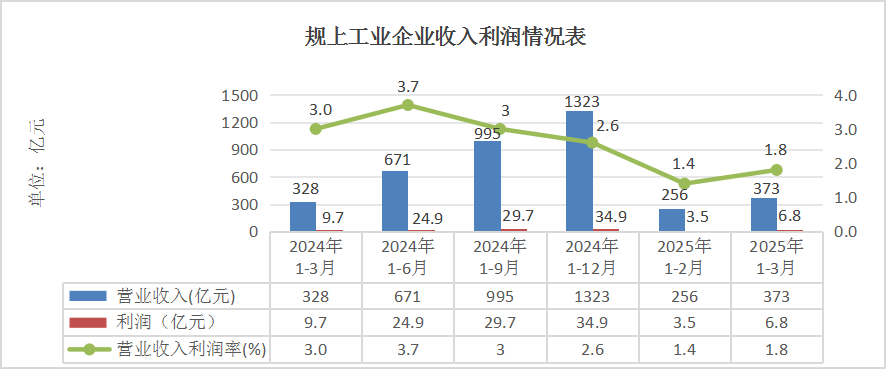 企业经营效益和盈利水平稳步提升。1-3月,规上工业企业实现主营业务收入373亿元,同比增长13.2%。实现利润6.82亿元,同比下降29.1%,降幅比1-2月收窄11个百分点。营业收入利润率1.8%,比1-2月提升0.4个百分点。