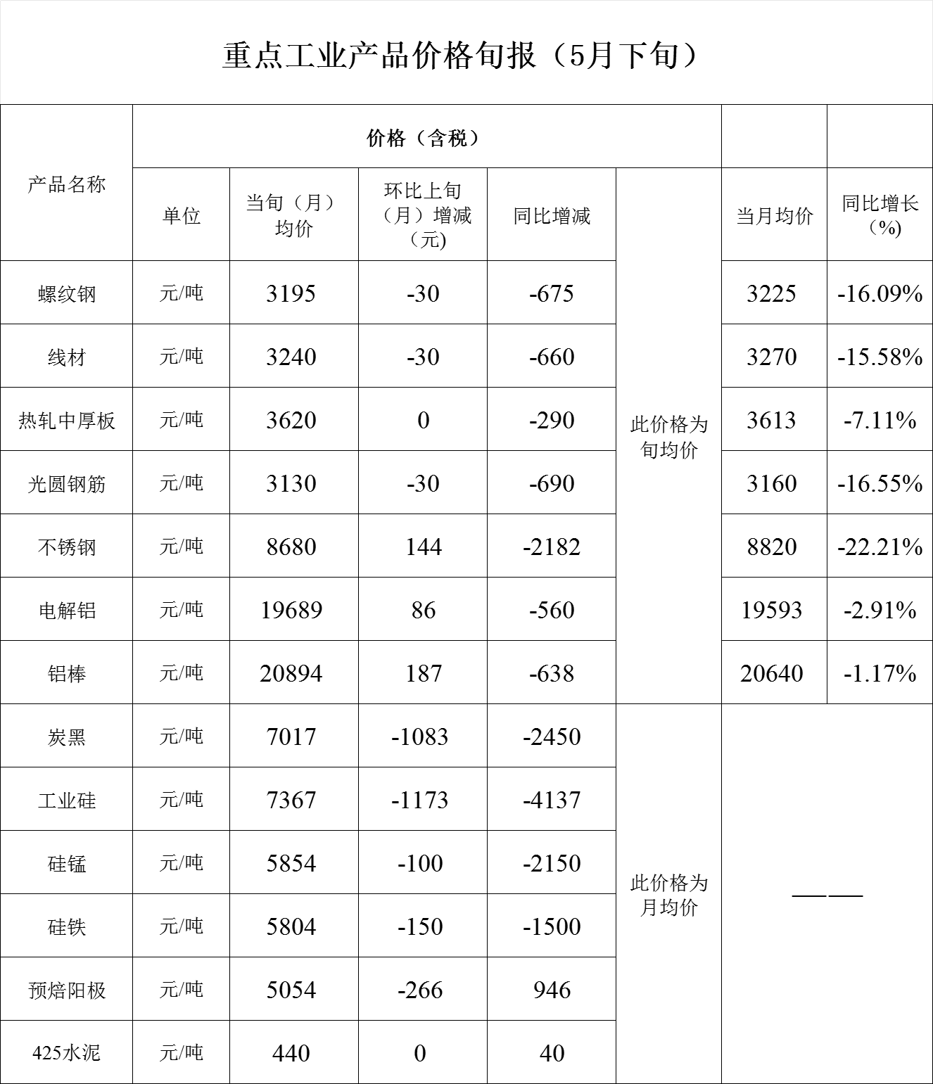 重点工业产品价格旬报(5月下旬)