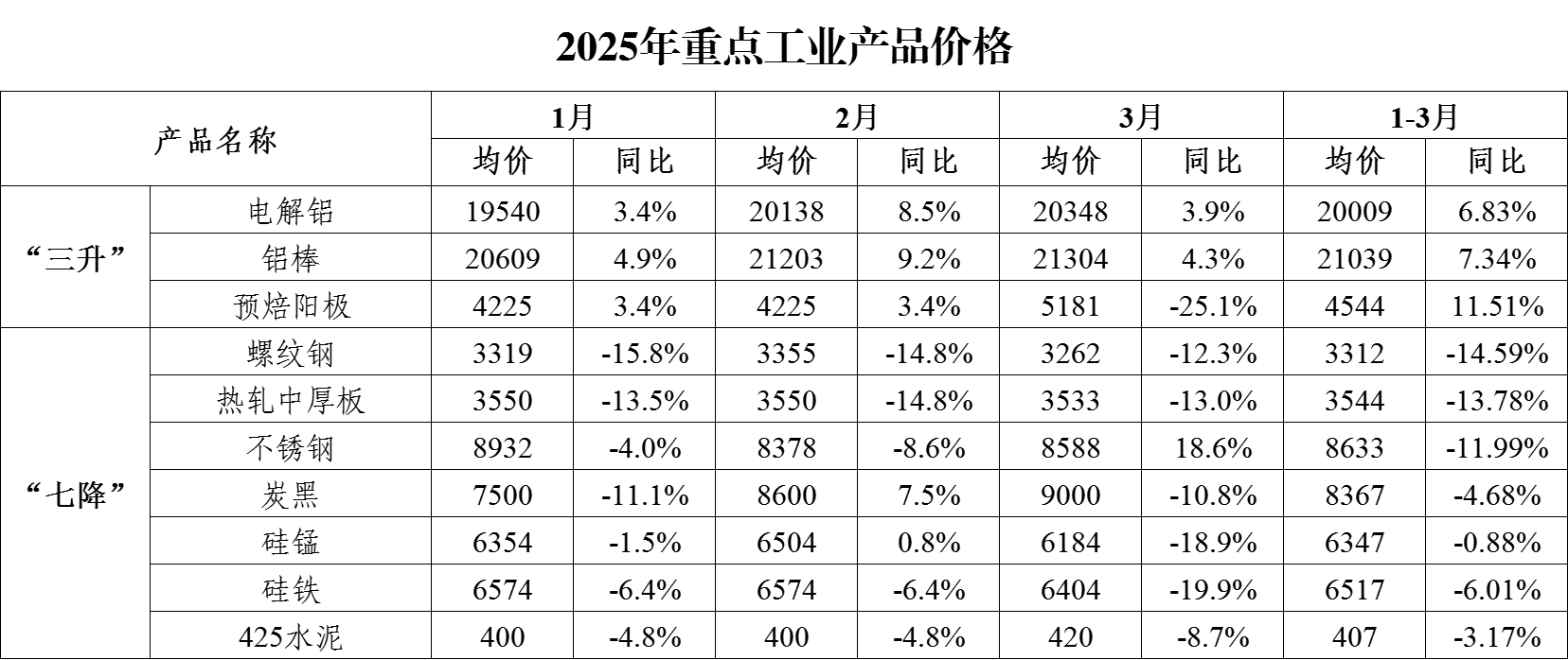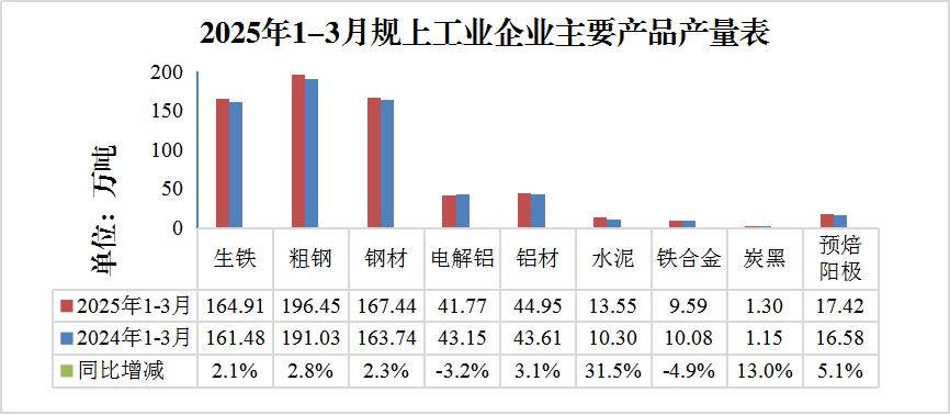 7种重点产品产量同比增长。一季度,重点监控的9种工业产品产量“七升两降”。其中,粗钢196.45万吨,增长2.8%;生铁164.91万吨,增长2.1%;铝材44.95万吨,增长3.1%;炭黑1.3万吨,增长13%;水泥13.55万吨,增长31.5%;预焙阳极17.42万吨,增长5.1%;钢材167.44万吨,增长2.3%;电解铝41.77万吨,下降3.2%;铁合金9.59万吨,下降4.9%。