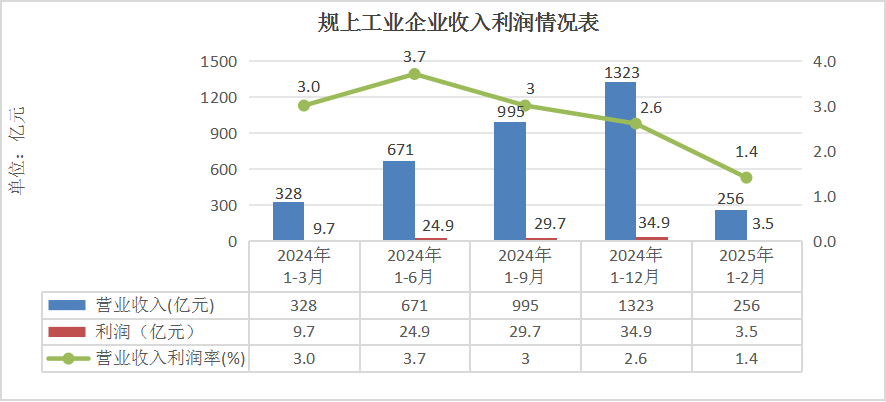 市属企业盈利能力翻倍增长。1-2月,规上工业企业实现主营业务收入256亿元,同比增长25.8%,实现利润3.47亿元,同比下降40.1%,营业收入利润率1.4%。其中,市属企业实现利润7509万元,同比增长104.7%。